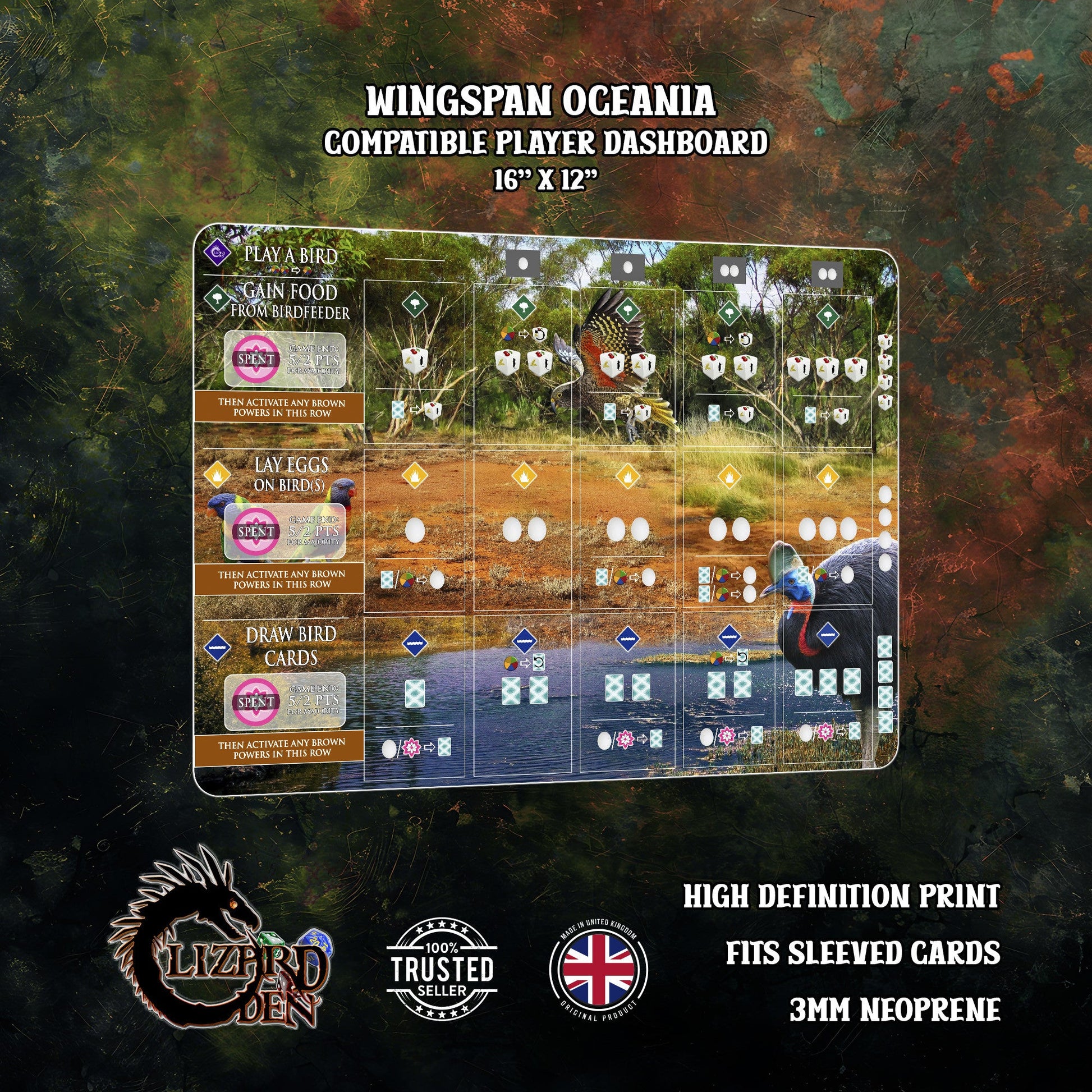 Enhance your Wingspan: Oceania experience with this beautifully printed, custom-made neoprene player mat, designed for bird lovers who enjoy a neat, immersive, and visually stunning gameplay setup.