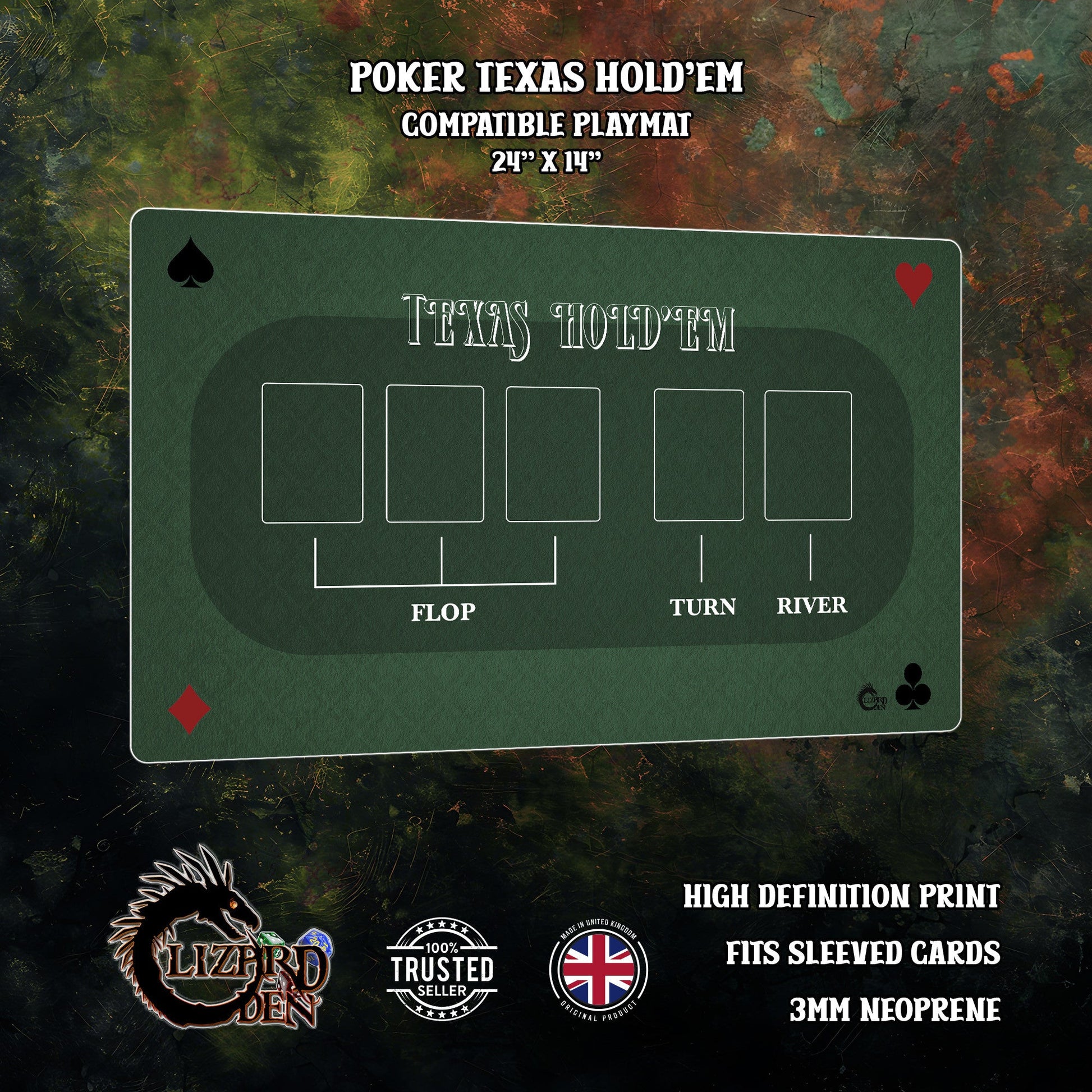 Featuring high-definition printing, this mat combines visual appeal with practical performance. The non-slip rubber backing keeps it securely in place during gameplay, while the flexible 3mm neoprene makes it easy to roll, store, and take with you — perfect for home games, tournaments, or as a gift for any poker enthusiast.
