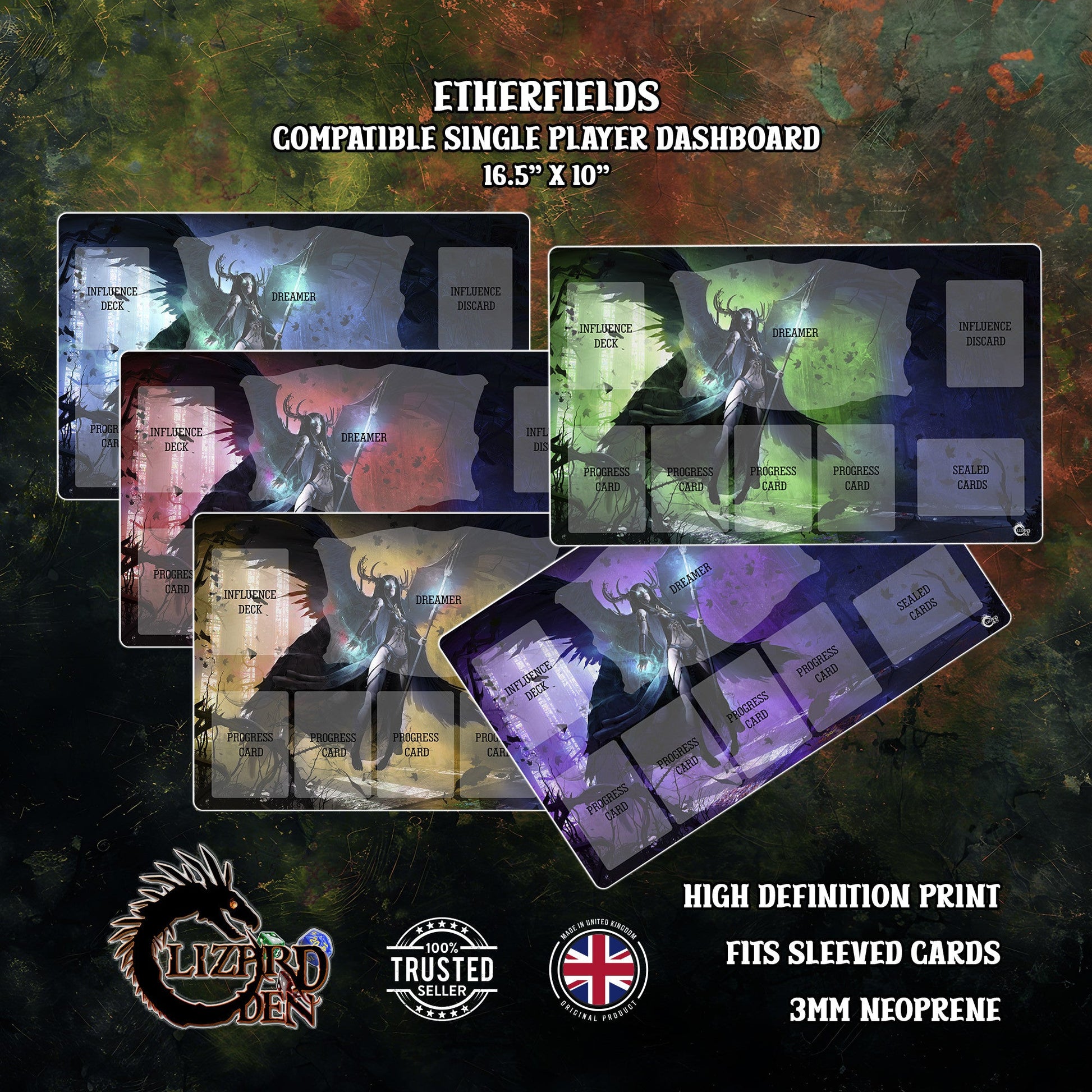 Immerse yourself deeper into the dream world of Etherfields with this beautifully printed, custom-made neoprene player dashboard mat — perfect for players who value a clean, organised, and thematic game setup.