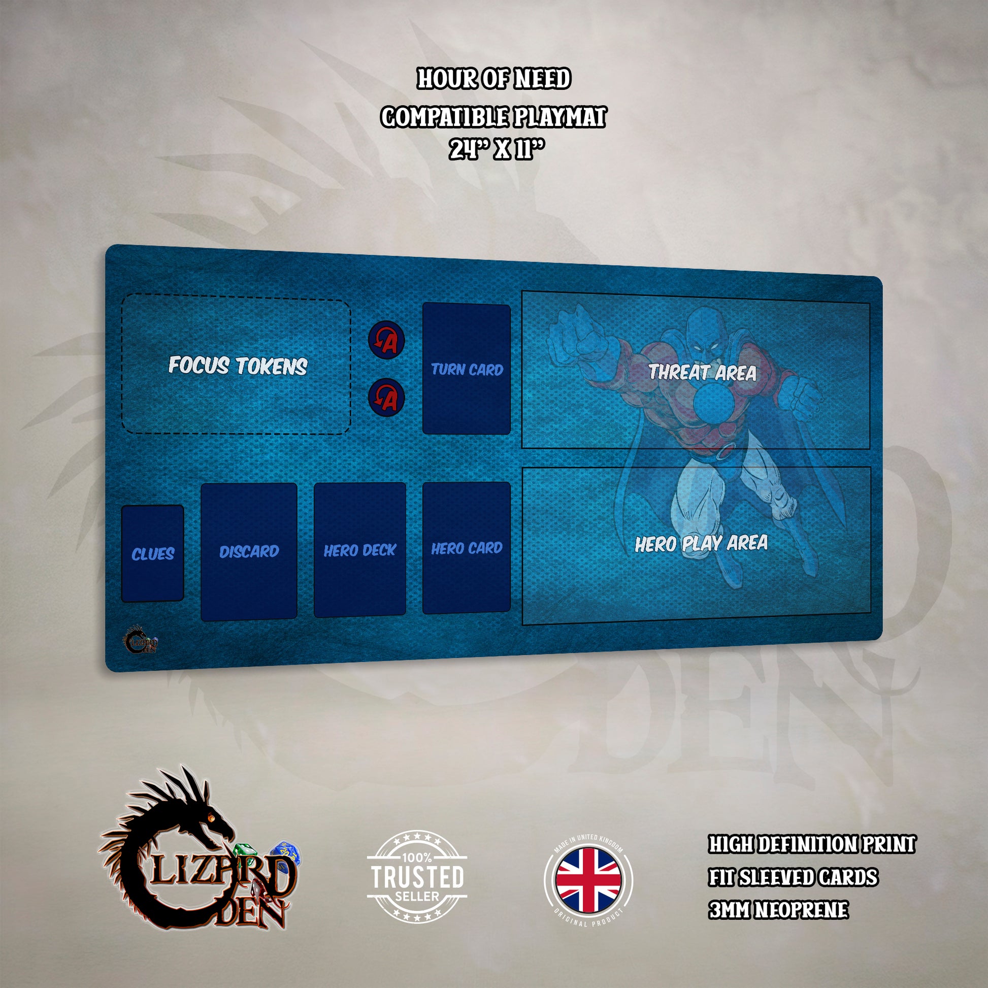 Bring order to your heroic showdowns with this beautifully printed, custom-made neoprene mat, designed for Hour of Need players who enjoy a clean, organised, and thematic play area.