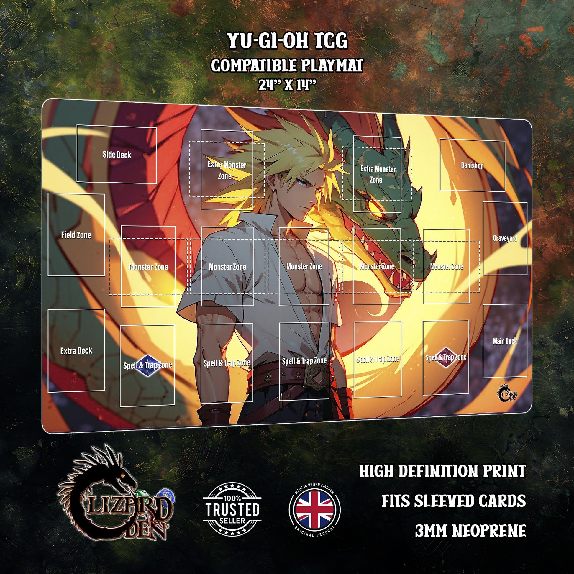 Crafted for competitive and casual players alike, this mat features a vibrant, high-resolution design inspired by the Yu-Gi-Oh! universe, creating an immersive battlefield for your duels. The smooth neoprene surface protects your cards and allows for effortless movement, while the non-slip rubber backing keeps the mat firmly in place — even during the most intense duels.