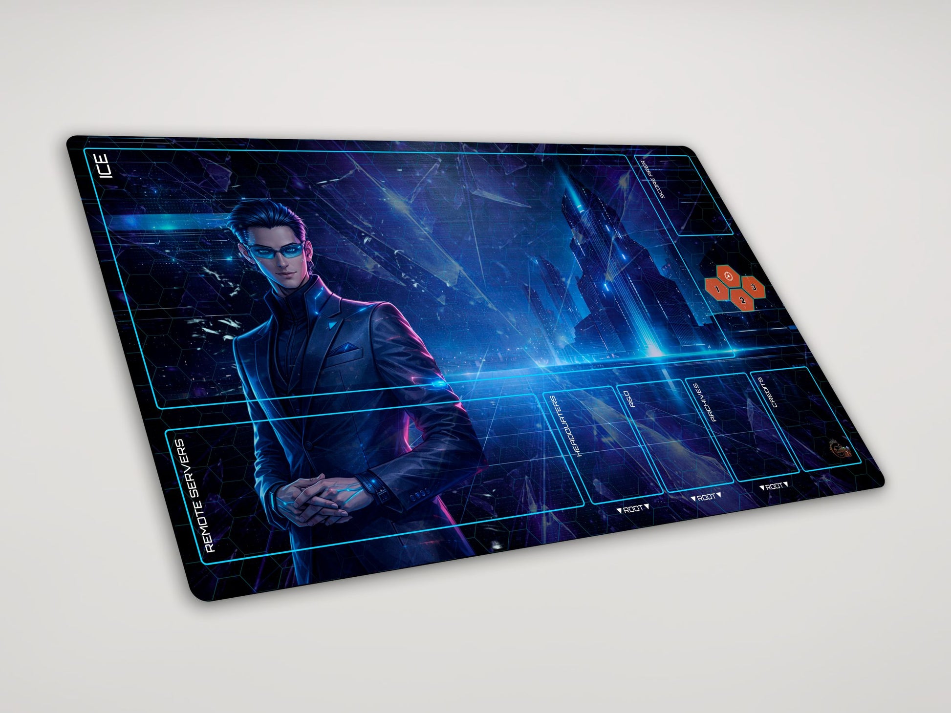 Featuring a sleek corporate aesthetic with a large ICE field and clearly organised server zones, this mat supports both tall builds and wide remote strategies. The smooth cloth surface improves card movement, while the non-slip rubber backing keeps everything secure during play.