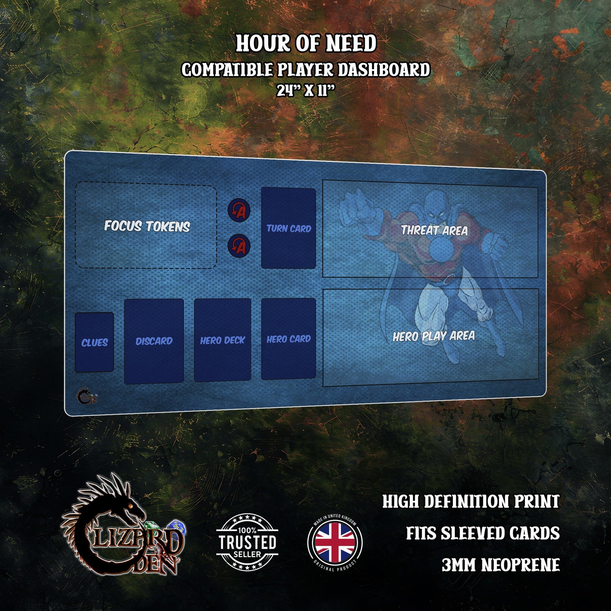 Bring order to your heroic showdowns with this beautifully printed, custom-made neoprene mat, designed for Hour of Need players who enjoy a clean, organised, and thematic play area.